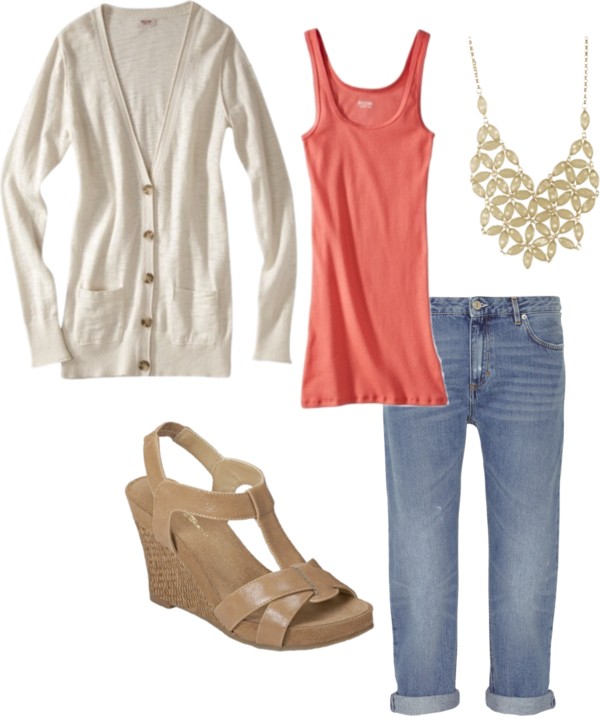 Neutral Cardigan + Bright Tank + Statement Necklace + Boyfriend Jeans + Wedges